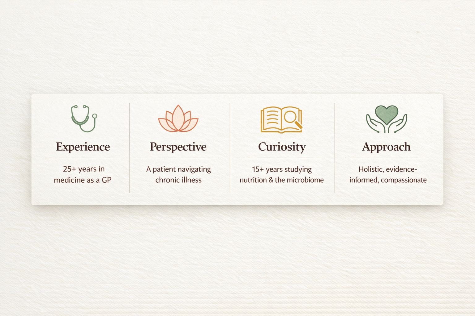 This website grew from a longstanding curiosity about the intersection between nutrition, chronic disease, immune function and the human microbiome. For more than 15 years, I have been exploring how diet, metabolic pathways and microbial ecosystems shape health — not just from textbooks or journal articles, but through my own lived experience. Personal health challenges shifted my focus away from clinical practice and toward academic research and self-directed study. During this time I completed accredited training in nutrition with Monash University (Australia), undertook a research project entitled The Role of Microbiome in Medicine, and began writing about topics that are often poorly understood or insufficiently discussed in routine healthcare.